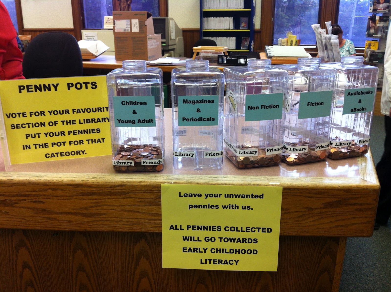 At the library, simply drop your pennies into one of our pots labeled with your favourite kind of books. The Friends will be keeping track of which kinds of books are collecting the most pennies...whether it’s Fiction or Non-Fiction, Reference, Magazines, Young Adult or Children’s.